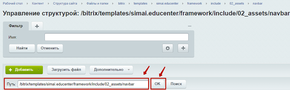 Шаг 2. В поле "Путь" указать /bitrix/templates/(название модуля, например simai.educenter)/framework/include/02_assets/navbar/, нажать ОК.