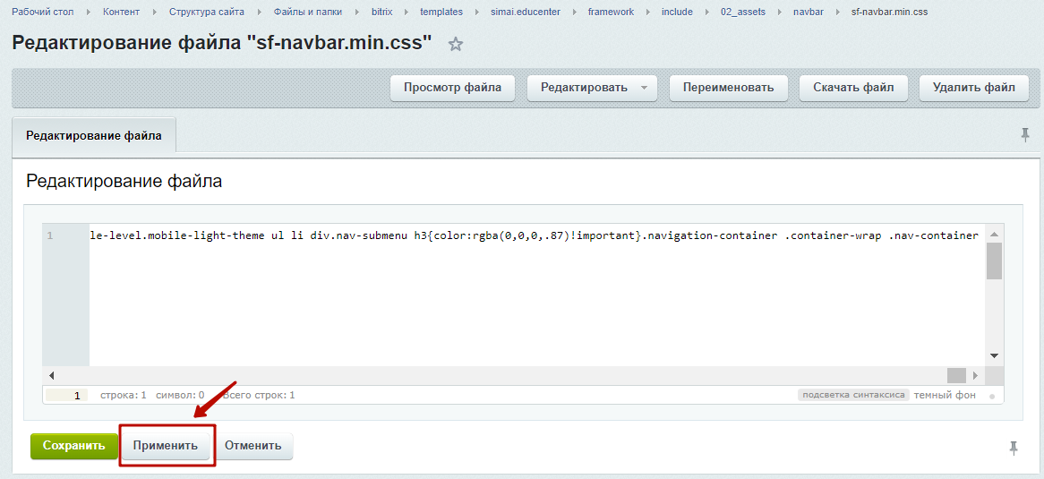 Шаг 7. В административной части сайта открыть файл sf-navbar.min.css в режиме редактирования PHP-кода.